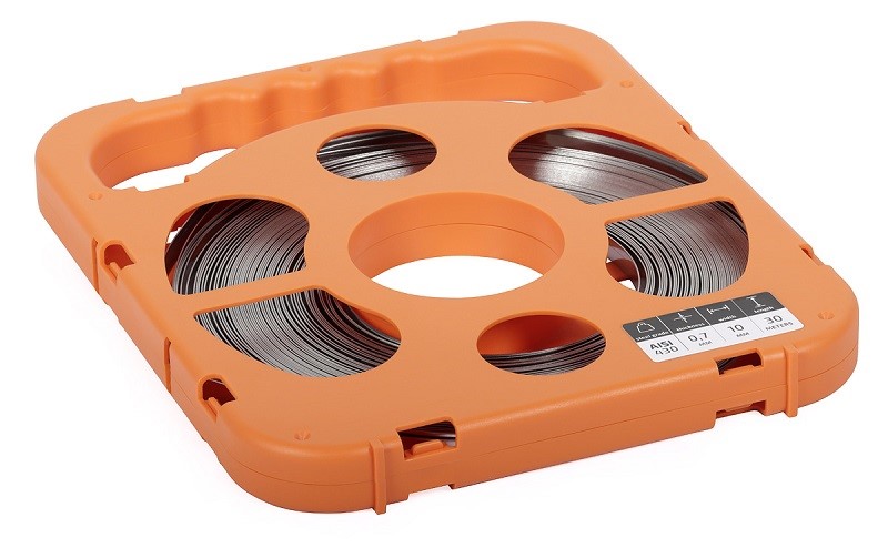 Stalowa taśma nierdzewna umieszczona w wygodnym pojemniku, zrobionym z plastiku, który ułatwia podawanie taśmy. Produkt może znaleźć swoje zastosowanie przy montażu stelaży na słupach, zawiesi.